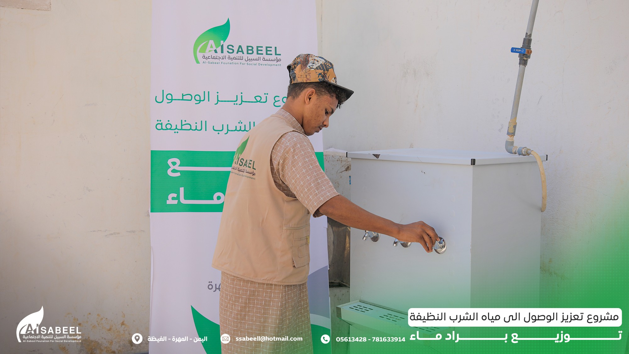 في إطار جهودها المستمرة لتحسين الأوضاع المعيشية والخدمية للمجتمع، نفذت مؤسسة السبيل للتنمية الاجتماعية مشروع تعزيز الوصول إلى مياه الشرب النظيفة من خلال توزيع برادات ماء في محافظة المهرة – مديرية الغيضة، ويأتي هذا المشروع استجابة لاحتياجات المواطنين وتخفيفاً من معاناتهم في الحصول على مياه صالحة للشرب.